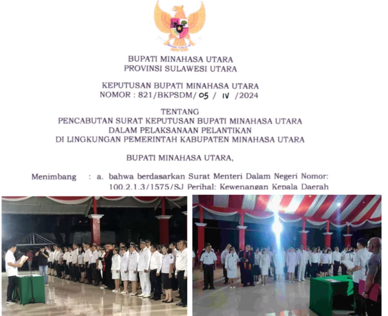 Minahasa Utara, www.inspirasikawanua.com – SK Pelantikan dijajaran Pemerintah Kabupaten Minahasa Utara (Minut) 22 Maret 2024 lalu resmi dicabut. Hal tersebut berdasarkan, KEPUTUSAN BUPATI MINAHASA UTARA NOMOR: 821/BKPSDM/05/IV/2024. TENTANG PENCABUTAN SURAT KEPUTUSAN BUPATI MINAHASA UTARA.