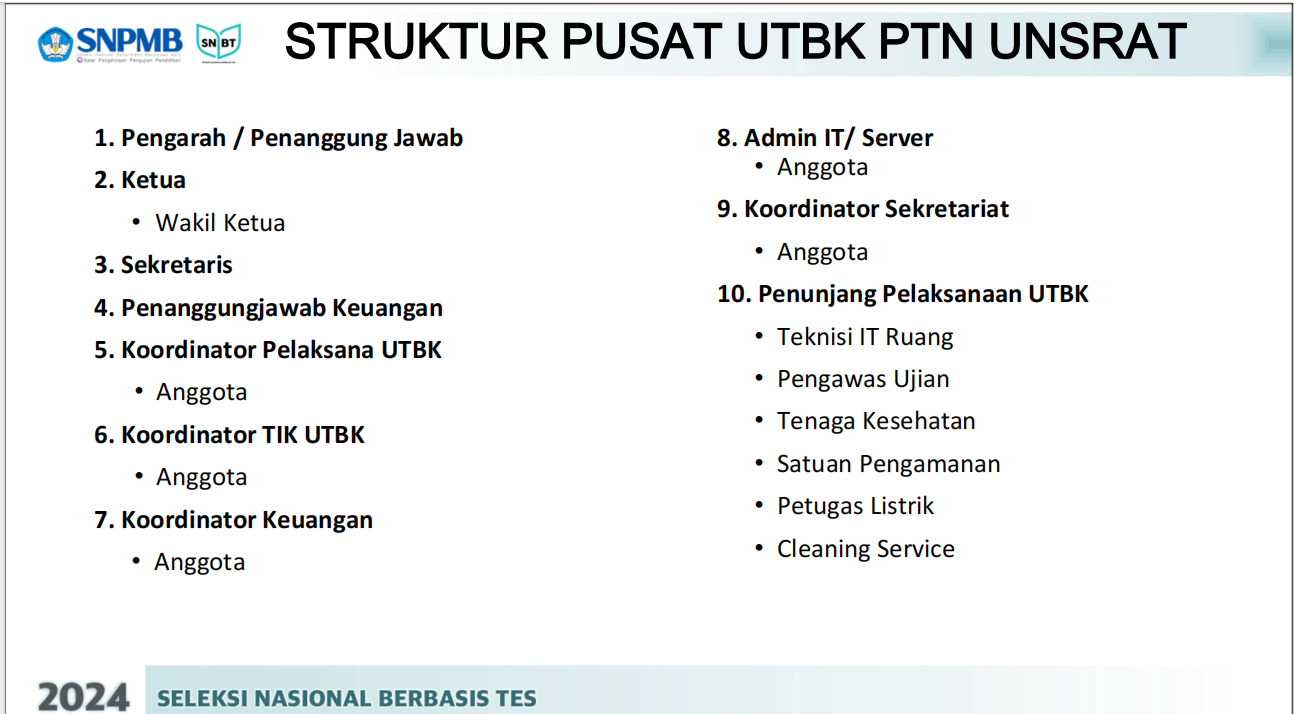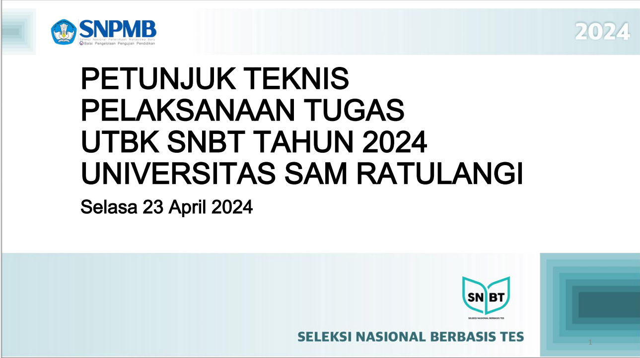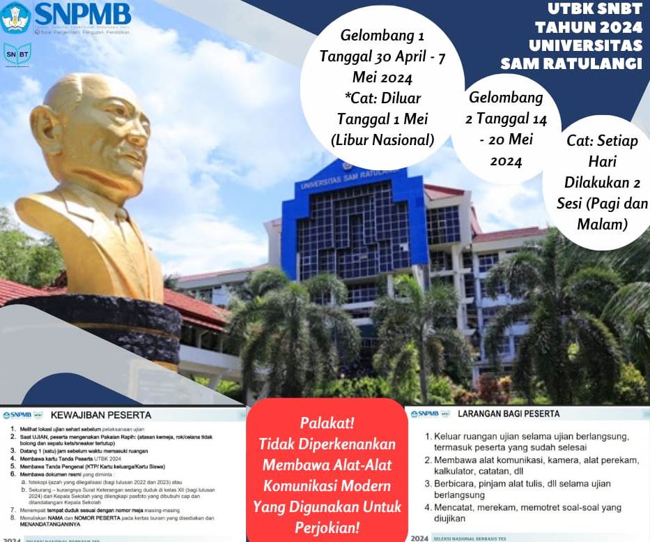 Ini Petunjuk Teknis Pelaksanaan Tugas UTBK SNBT Tahun 2024 Universitas Sam Ratulangi Mei 1, 2024Juni 12, 2024oleh adminoleh admin Yuk! baca berita menarik lainnya dari Inspirasi Kawanua di saluran WHATSAPPBaca juga: Sepakat, DPRD dan Pemkot Manado Tetapkan APBD Tahun 2022 Baca jugaMinahasa Selatan Perkuat Tata Kelola Pemerintahan dengan Sinergi Hukum bersama Kejaksaan Negeri Minahasa Selatan Gebrak Pasar Internasional dengan Ekspor Perdana Produk Olahan Kelapa ke China!384 Jemaah Calon Haji Asal Sulut Tahun 1447 Hijriah/2026 Dilepas Gubernur Yulius SelvanusViral di Medsos, Pemuda Dianiaya Warga di Minahasa Selatan, Lokasi Kejadian Jadi SorotanGubernur Yulius Selvanus Buka Orientasi PPPK Tahun 2026, Tekankan Pentingnya Disiplin, Semangat, dan Dedikasi ASN