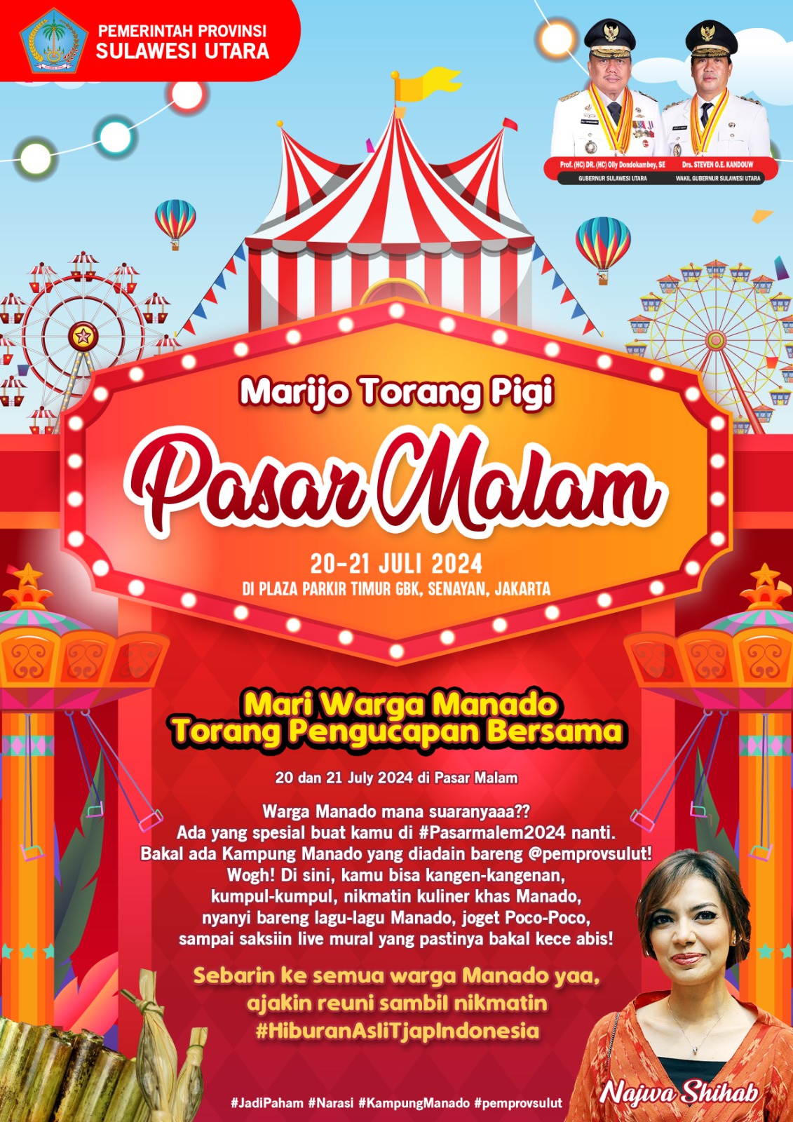 Pasar Malam dengan ciri khas Manado ini, terselenggara atas kerjasama Pemerintah Provinsi (Pemprov) Sulawesi Utara (Sulut) dengan Narasi TV Pimpinan Najwa Shihab. (Advertorial DKIPS-IK Pemprov Sulut)