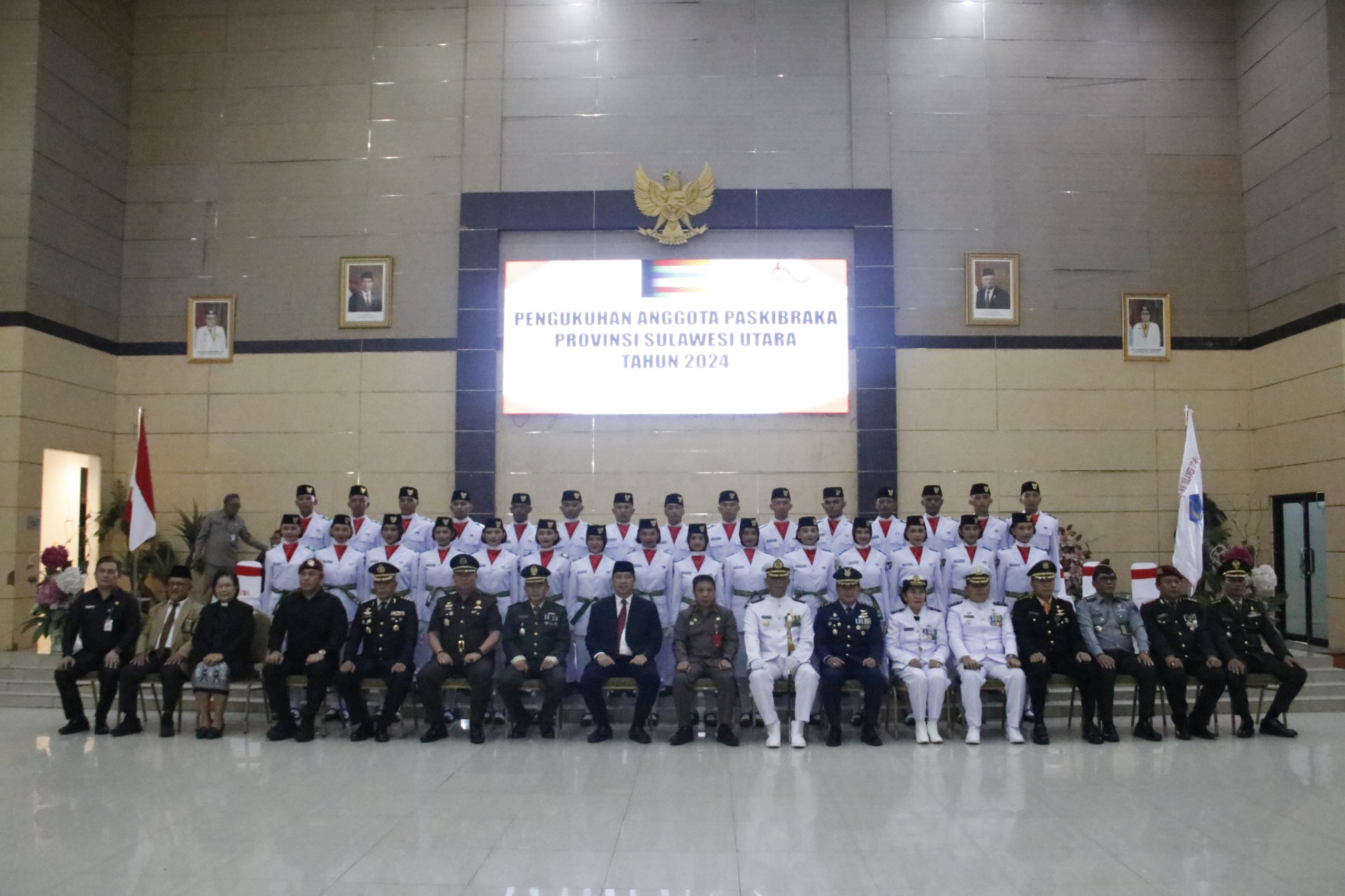 Menjelang pelaksanaan upacara pengibaran bendera HUT ke-79 Proklamasi Kemerdekaan Republik Indonesia, Wakil Gubernur Provinsi Sulawesi Utara, Steven Kandouw mengukuhkan anggota Paskibraka Provinsi Sulut tahun 2024, di Graha Gubernuran Bumi Beringin Manado, Kamis (15/8/2024).