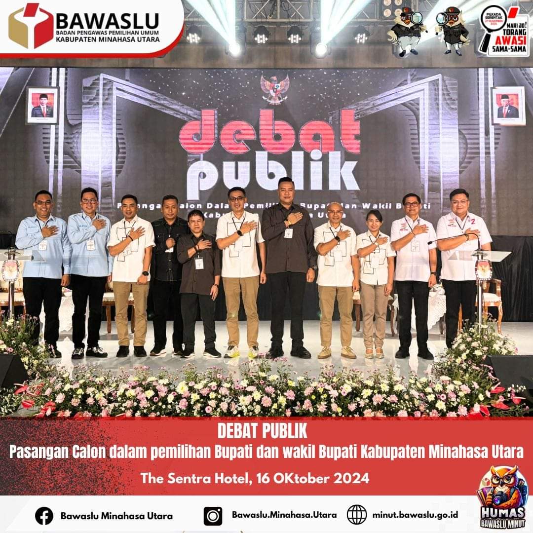 Minahasa Utara, www.inspirasikawanua.com — Tiga pimpinan Badan Pengawas Pemilu (Bawaslu) Kabupaten Minahasa Utara (Minut), yakni Ketua Rocky M Ambar, SH, LL.M, M.Kn, Koordiv Waldi Mokodompit, S.Pd dan Simon H. Awuy, SH, MH, menghadiri debat publik pertama pasangan calon (Paslon) kepala daerah, Kamis (16/10/2024).