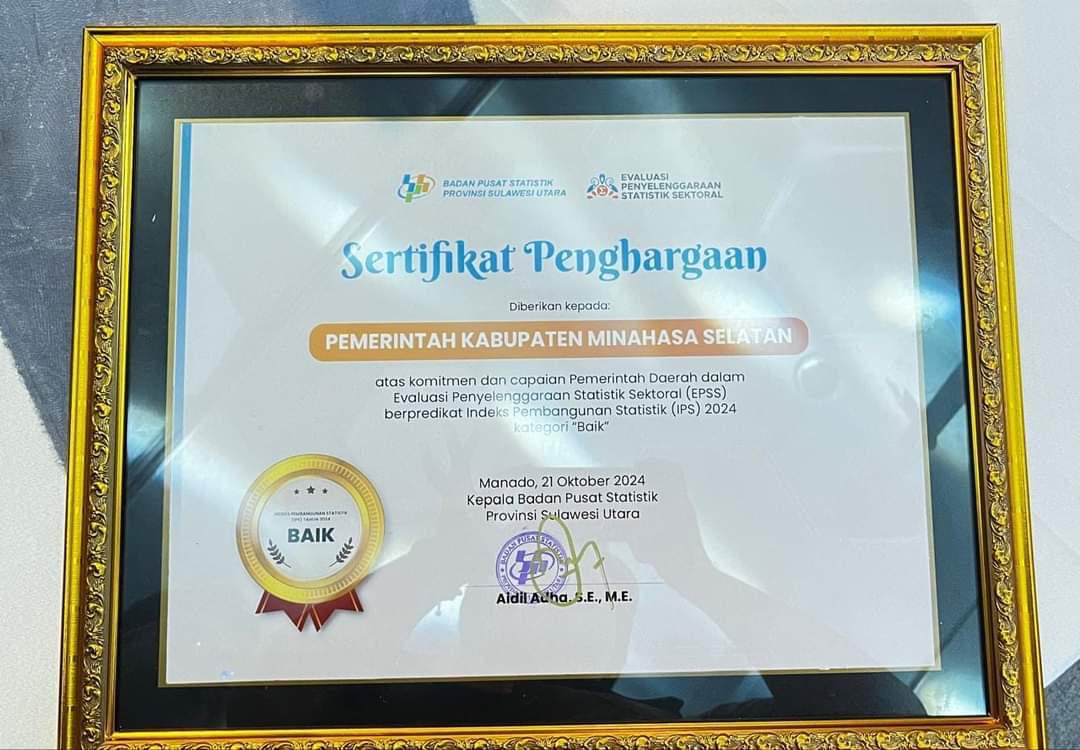 Penghargaan ini diberikan kepada Minahasa Selatan karena berhasil meraih Indeks Pembangunan Statistik (IPS) dengan kategori Baik.