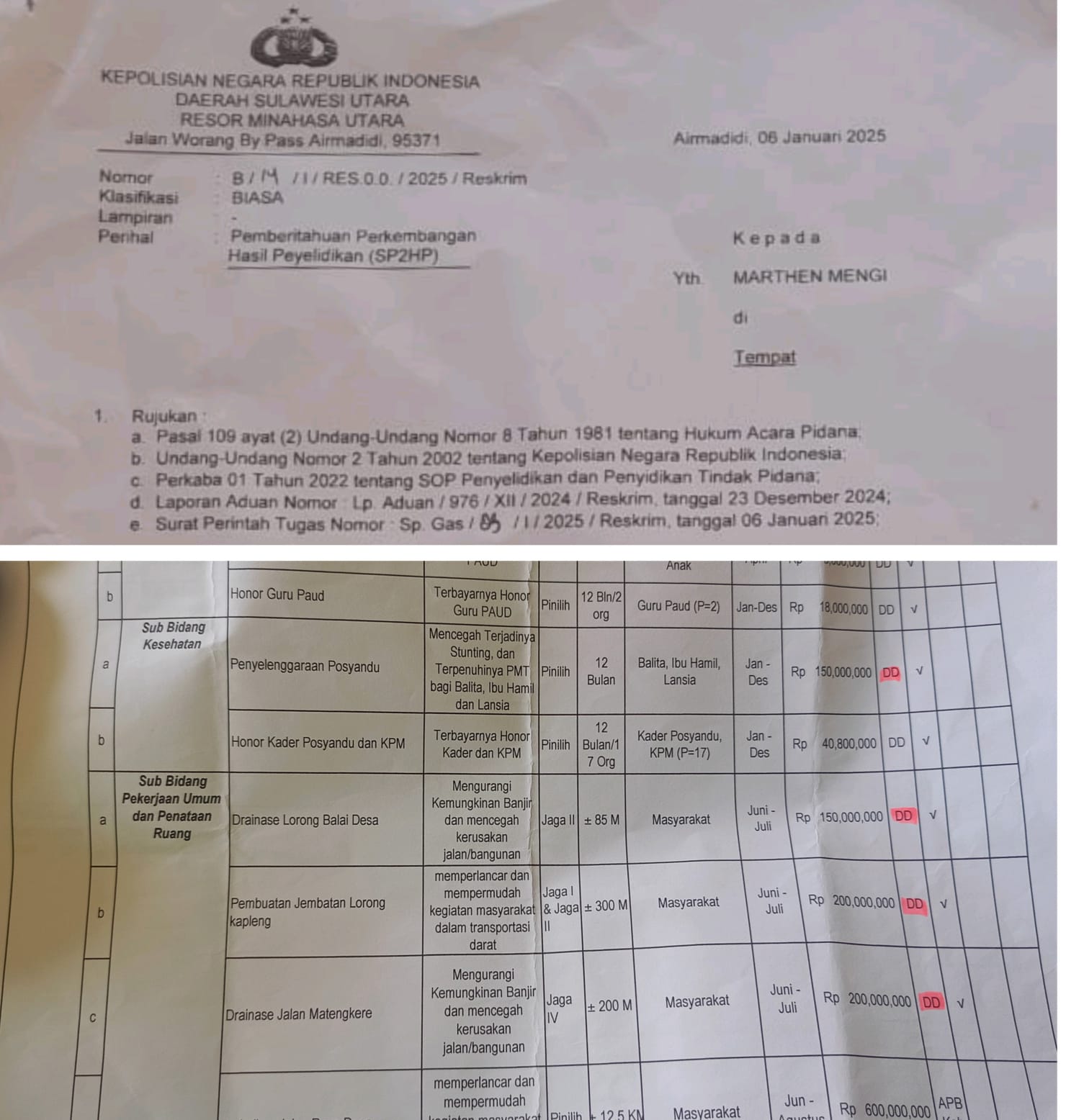 “Semakin aneh lagi, program ketahanan pangan (Ayam petelur) tahun 2024, namun oleh Hukum Tua baru direalisasikan bulan Januari kemarin (2025). Itu pun nanti ketika kami sudah buat laporan ke Polres,” sambungnya.