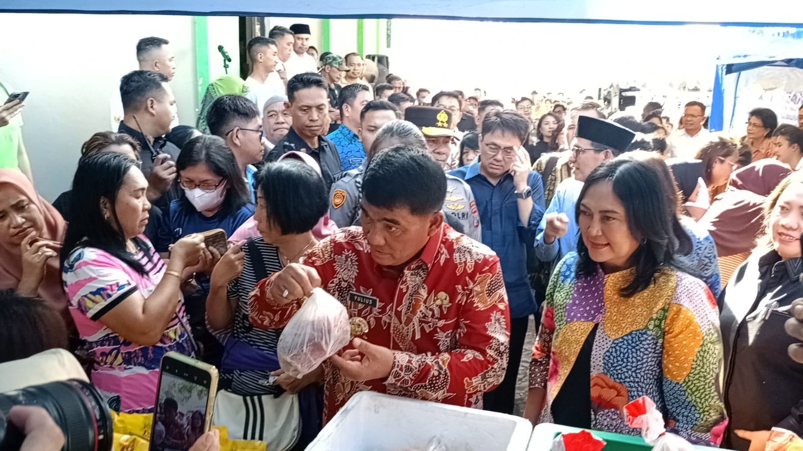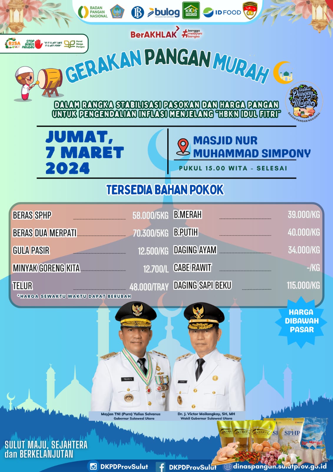 Manado, www.inspirasikawanua.com – Pemerintah Provinsi Sulawesi Utara dibawah kepemimpinan Gubernur Mayjen TNI (Purn) Yulius Selvanus dan Wakil Gubernur Victor Mailangkay menggelar Gerakan Pangan Murah (GPM), Jumat (7/3/2025) petang, di Masjid Nur Muhammad Simpony, Kelurahan Tuminting Kota Manado.