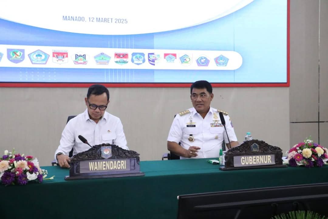 Manado, www.inspirasikawanua.com – Gubernur Provinsi Sulawesi Utara (Sulut) Mayjen TNI (Purn) Yulius Selvanus SE mendampingi Wakil Menteri Dalam Negeri, Bima Arya Sugiarto dalam kegiatan Rapat Koordinasi Pengelolaan Keuangan dan Asistensi Efisiensi Belanja pada APBD Tahun Anggaran 2025 yang berlangsung di ruang Mapalus Kantor Gubernur, Rabu (12/3/2025).