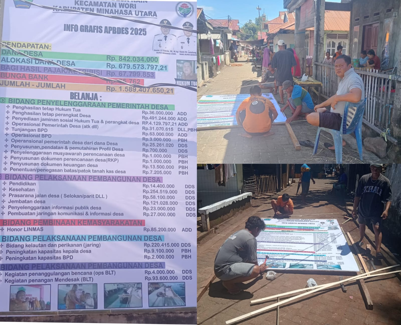 Minahasa Utara, www.inspirasikawanua.com – Dalam rangka mendukung transparansi dan keterbukaan informasi publik, Pemerintah Desa Nain, Kecamatan Wori, Kabupaten Minahasa Utara, pada Kamis (1/5/2025), telah melaksanakan pemasangan baliho Anggaran Pendapatan dan Belanja Desa (APBDES) Tahun Anggaran 2025.