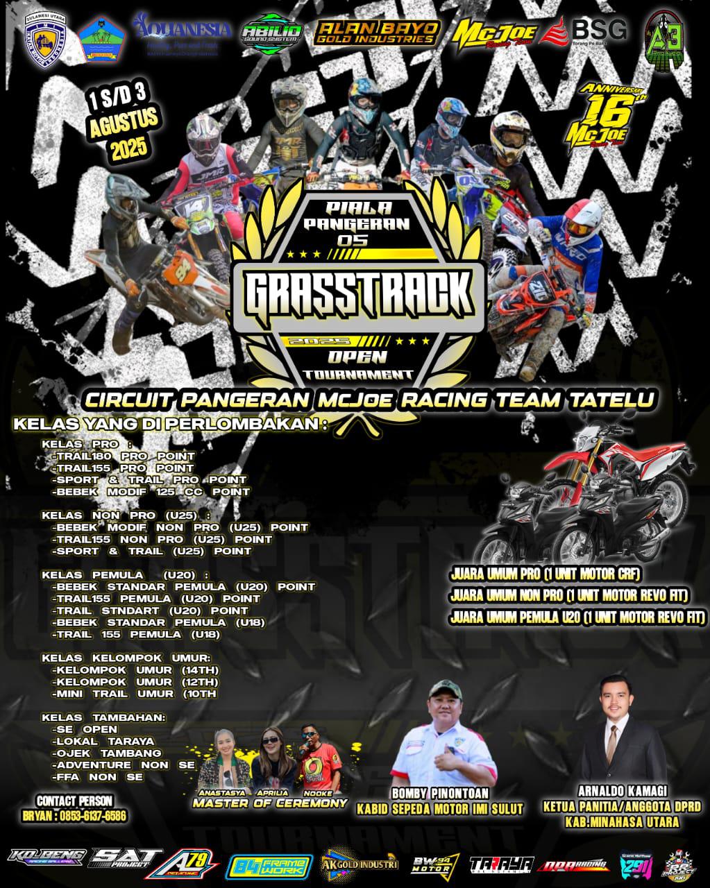 Minahasa Utara, www.inspirasikawanua.com – Event Grasstrack Piala Pangeran 05 yang akan digelar pada 1 hingga 3 Agustus 2025 di Circuit Pangeran MC Joe Racing Team Tatelu, siap menjadi ajang kebangkitan olahraga grasstrack di Provinsi Sulawesi Utara. Event yang mengusung konsep Open Tournament ini menghadirkan berbagai kelas lomba mulai dari kelas Pro, Non-Pro hingga kelas pemula dan kelompok umur.