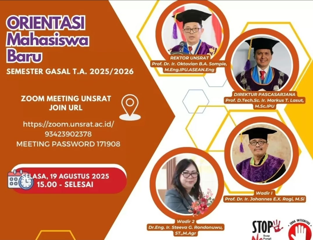 Manado, www.inspirasikawanua.com – Program Pascasarjana Universitas Sam Ratulangi (Unsrat) Manado akan menggelar kegiatan Orientasi Mahasiswa Baru tahun akademik 2025/2026.